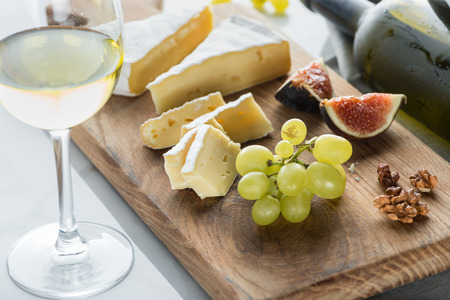 close up view of camembert cheese, grape and fig pieces on cutting board with glass of wine near by on white tabletop