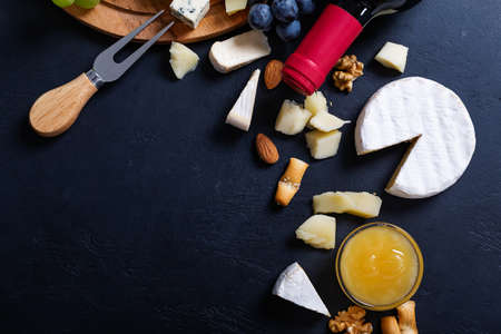 Assortment of cheeses and wine on black background. Top view