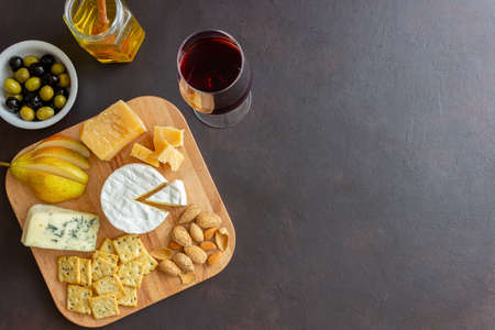 Red wine and set of different cheeses on a wooden board, delicious snack, healthy and exclusive food