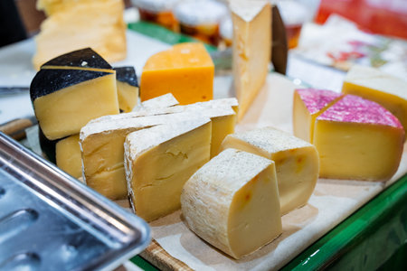 Close up view - assortment of delicious handmade yellow cheeses for sale on counter of local farmers market, shop or grocery. Gastronomy and food concept