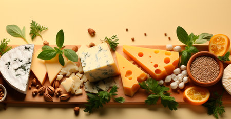 Assortment of dairy handmade milk products, top view. Quality sorts of winery cheese and Caciotta with herbs and pistachio, traditional cuisine and healthy food concept