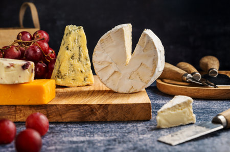 assorted dor blue cheese with mozzarella with grapes on a wooden board