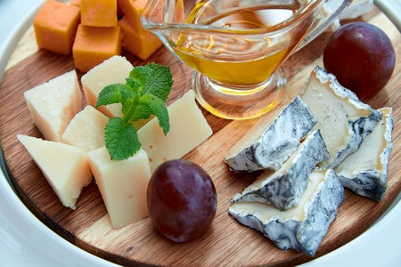 Different kinds of cheese served with grape and honey for gourmet nutrition. Organic parmesan and hard cheese set delicatessen