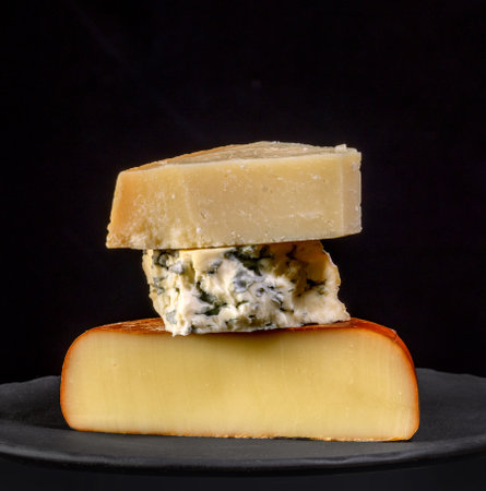 Stack of cheeses standing on wooden board. Camembert, parmesan, edam. Studio shot. Side view. Dairy food and cooking at home concept for flyers and banners