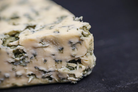 Fresh farm products. A piece of blue and yellow, fresh, aged, natural farm cheese with lavender and nuts on a wooden board.