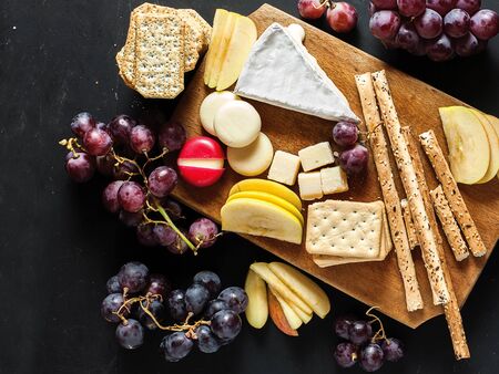 Cheese platter on cutting board with pieces of fresh sliced apple and vine grains on a black chalkboard background. Cheese plate for horeca menu for restaurant, cafe, eating house etc. Consists of several types of cheese, including blue cheese.