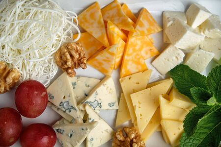 Close-up of a cheese plate. 4 types of cheese, soft white brie cheese, camembert, semi-soft briques, blue, roquefort, hard cheese. Walnuts, green grapes. Beautiful serve. restaurant.