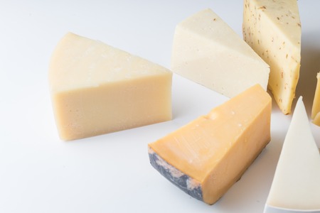 pieces of mouth-watering fresh gouda cheese isolated on white