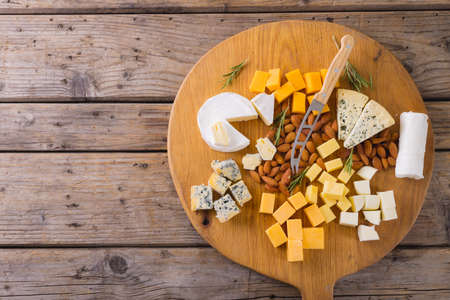Cheese delikatessen top view on rustic wood. Wooden round desk with blue cheese roquefort, parmesan, camembert and brie cuts decorated with garlic, pomegranate and basil, french cuisine ingredients