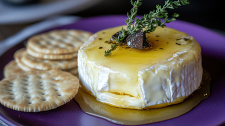 Experience the elegance of gourmet soft cheese drizzled with honey and decorated with fresh herbs, accompanied by crispy crackers for a refined appetizer.