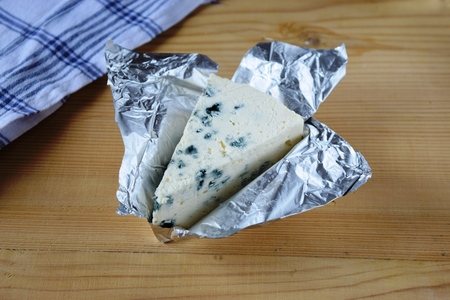 Wedge of French blue cheese on foil