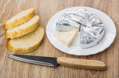 Melted cheese in foil in plate, pieces of bread and kitchen knife on wooden table