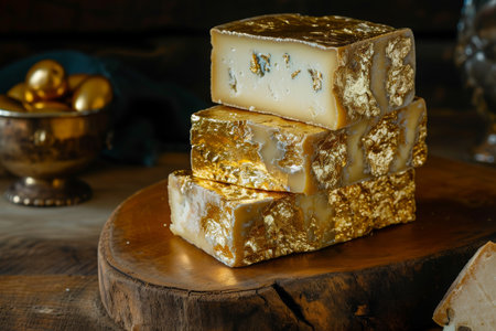 Three bars of soap neatly arranged on top of each other, Whole Stilton Cheese covered in edible gold leaf, AI Generated
