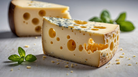 Two cheese wedges with holes present a gourmet still life, adorned with fresh basil leaves Ideal for culinary and gastronomy projects.