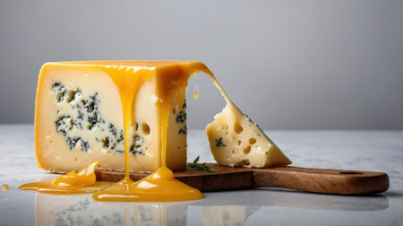 A block of blue cheese sits next to a slice on a wooden board with honey drizzled on top Ready for food photography and culinary promotions.