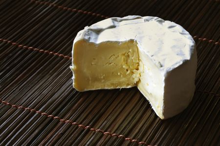 A mini-wheel of creamy brie cheese, on bamboo mat.