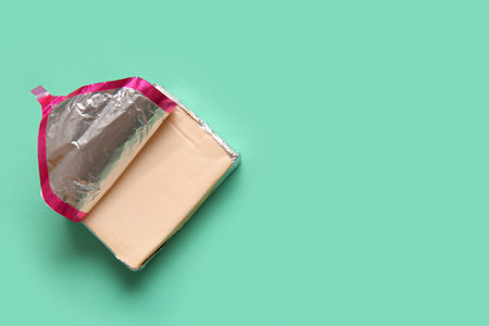 Processed cheese in foil on turquoise background