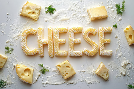 Slabs of cheese are artistically arranged to form the word cheese, surrounded by smaller cheese pieces and fresh herbs. The setting features a clean, white surface that enhances the presentation.