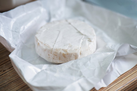 A freshly unwrapped round Camembert cheese with white mold, ready for gourmet dining.