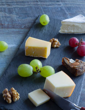 Cheese plate or board with variety of cheese, crackers, nuts and grapes