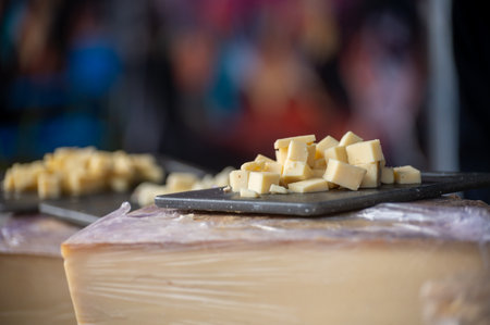 Tasting of different hard cheeses in Italian cheese farm shop, tasting cubes on board