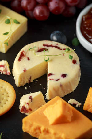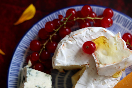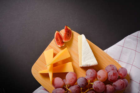 Directly above of tasty healthy cheeseboard with hard and soft French cheese, pink grapes and segments of fig. White mould cheese Brie with fruit cuts and grape on black background with kitchen towel