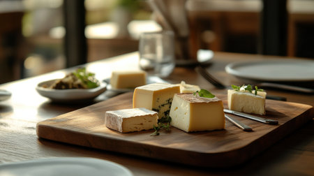 A variety of gourmet cheeses are arranged on a rustic wooden board, perfect for sharing during a leisurely meal in a cozy dining setting. Fresh herbs and small dishes of sides accompany them