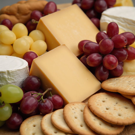 Cheese board with assorted cheeses grapes crackers for breakfast