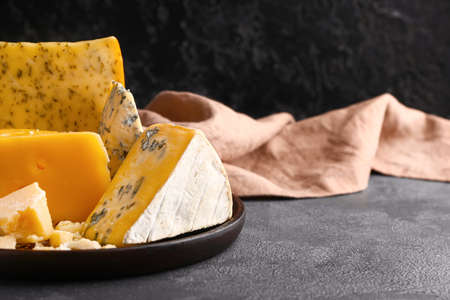 Round cheese plate, with different varieties of dairy, hard cheese (brie, home cheese, gouda, mildew cheese) with green, vertically, centered, black background, nobody
