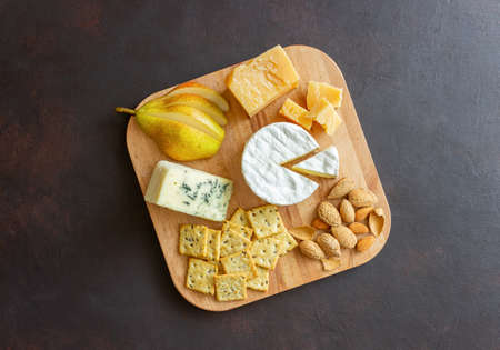 Assortment of cheese with fruits and nuts. Assorted cheeses Camembert, Brie, Parmesan blue cheese, goat