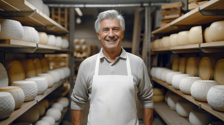 Expert cheese artisan holds his finest creation amidst neatly arranged cheese shelves in the background