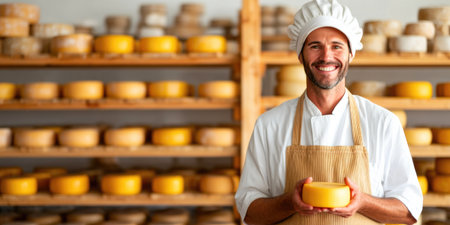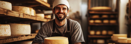 A dedicated male cheesemaker, in a traditional apron, holds a freshly made wheel of cheese in front of rustic wooden shelves filled with aging cheese, showcasing his craft, banner