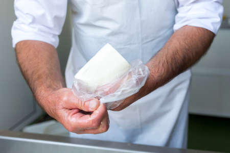 The process of producing tasty traditional white Bulgarian feta cheese at its final stage before packeting.