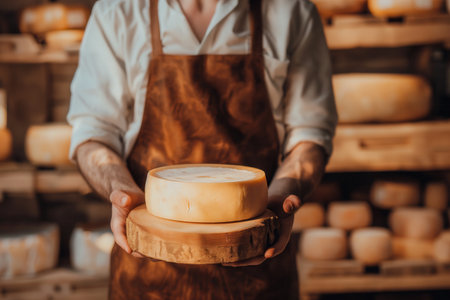 Cheesemaker holding artisanal rounds in rustic cellar, cheese craftsmanship concept
