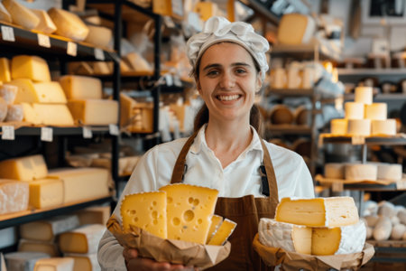 A smiling cheese vendor, 30, showcasing cheese varieties in a European shop