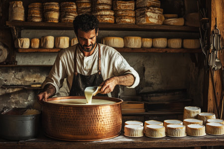 A male cheesemaker stirs milk in a large copper vat inside a traditional dairy, surrounded by cheese molds and tools, showcasing the craftsmanship of dairy production