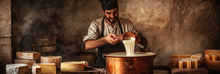 A man cheesemaker stirs milk in a copper vat inside a rustic dairy, with tools and cheese molds around his, capturing the essence of handmade, traditional cheese production, banner