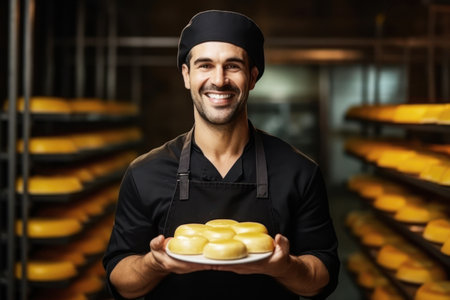 Expert cheesemaker displays a beautifully crafted cheese wheel with confidence cheese in hands