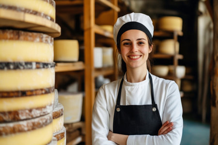 A female cheesemaker in a white uniform and black apron stands in her cheese cellar, surrounded by wooden shelves filled with handmade cheese wheels, showcasing her artisanal production