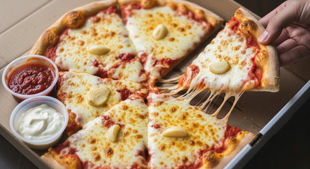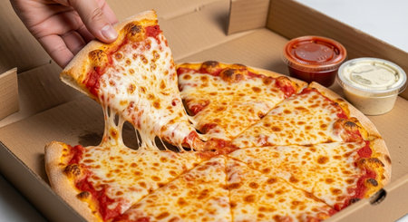 Hand grabbing a slice of pizza, melted cheese