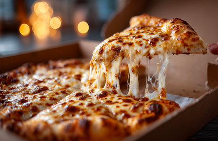 Cheese pizza with melted cheese pulled from the box at a gathering