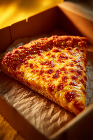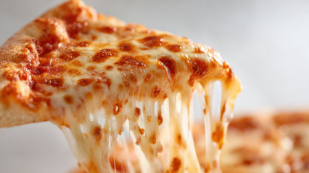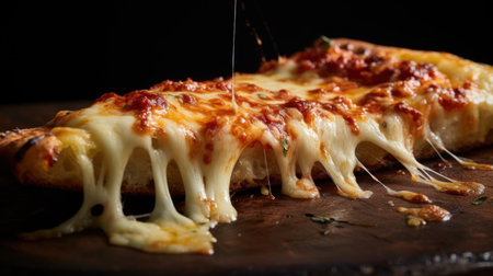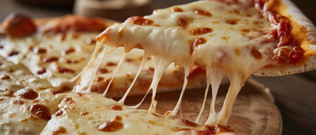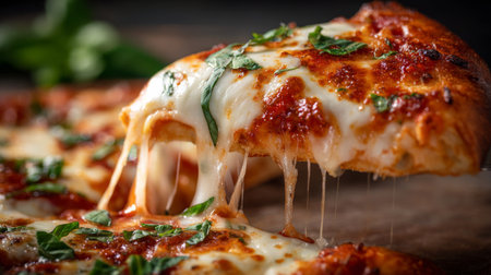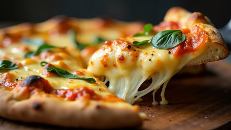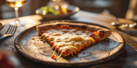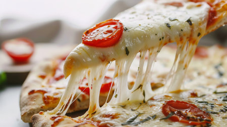 Gourmet Italian pizza slice with melting mozzarella cheese and fresh tomatoes
