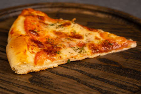 A piece of delicious pizza on a wooden oak board. Top view of a delicious freshly baked hot pizza