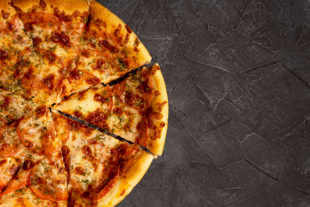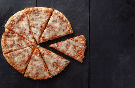 Italian pizza in slices on dark wooden cutting board with copy space