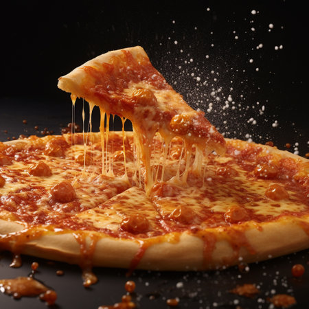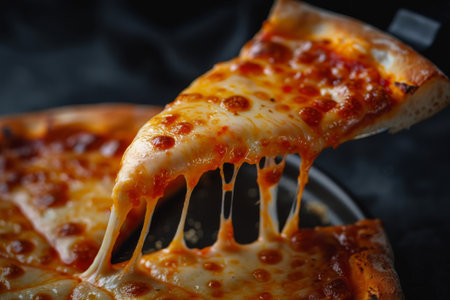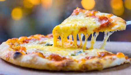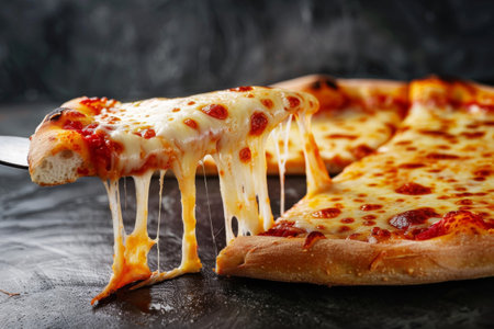 cheesy pizza slice. Pizza is a savory dish of Italian origin, consisting of a usually round.