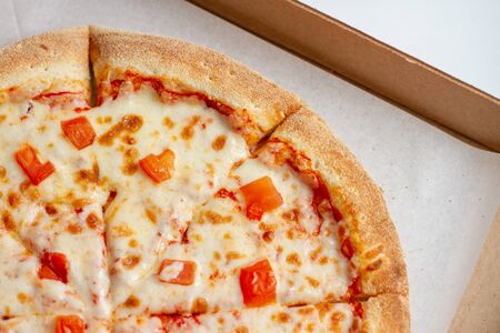 Close-up of Margarita pizza in a disposable dish. Top view of takeaway food in a fast food cafe. On photo - mozzarella cheese, tomatoes, and red basil. The classic recipe. Food for family and friends.