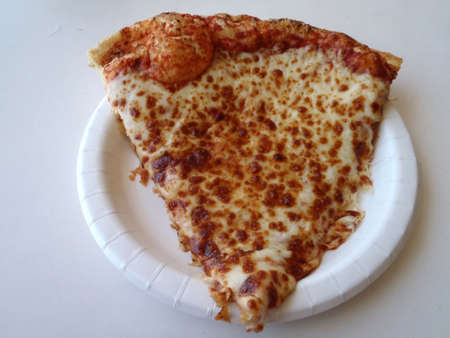 close up of Greasy Pizza plain Cheese on a paper plate sitting on a white table.