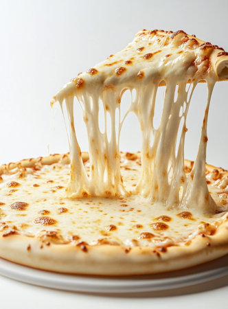 Pizza with very much cheese melting. Hot pizza slice with melting cheese isolated on a white background.