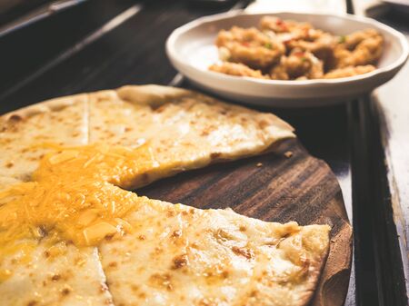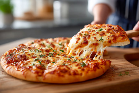 Delicious cheese pizza on classic wooden plate.