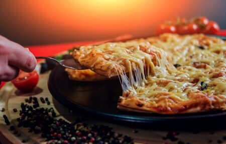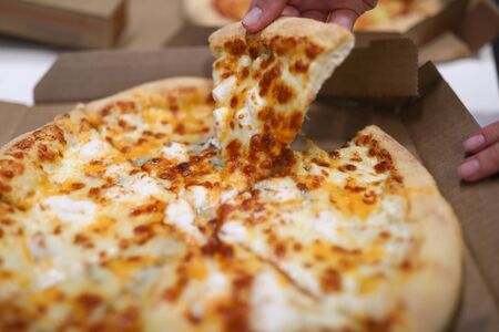 Man takes a slice of pizza melted cheese stretches on slice of hot pizza. Delicious Pizza, close up shot. Nutrition dinner or lunch
